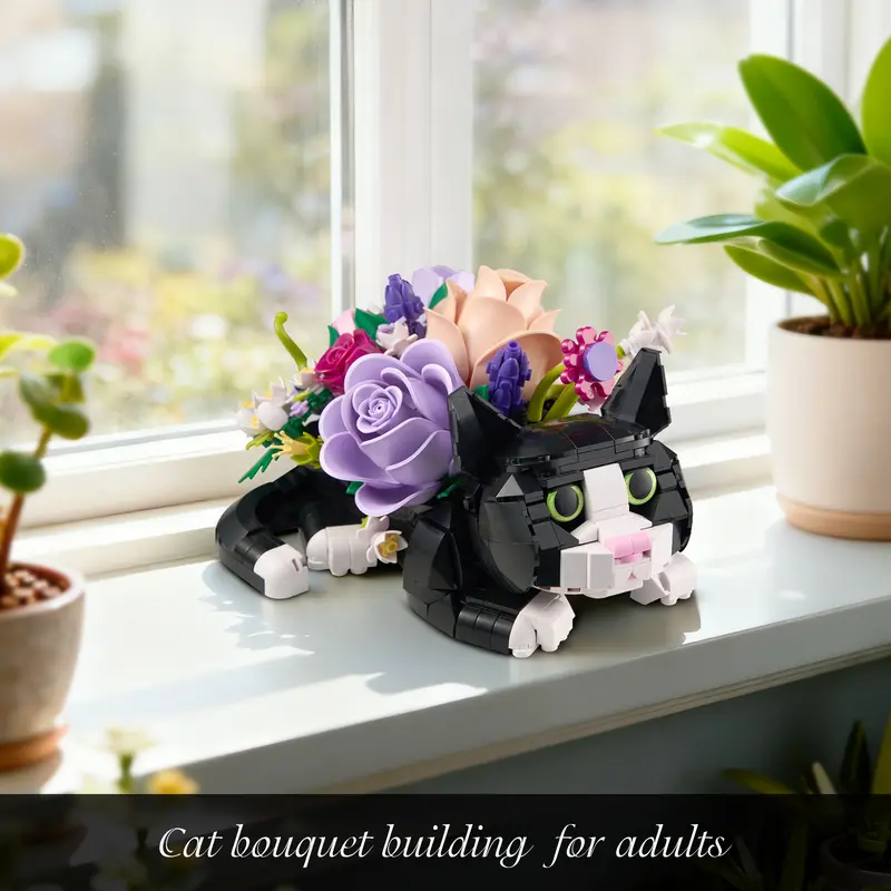 The Creative Cat Design Flower Bouquet Block Set for Decor delivers an engaging building experience and a decorative centerpiece in one package. Featuring tuxedo cat block kit details, floral brick building toy elegance, and DIY cat home decor appeal, it makes a thoughtful gift and creative hobby project. Ideal for adults who enjoy design and cats, this set brings charm and artistry into any space.